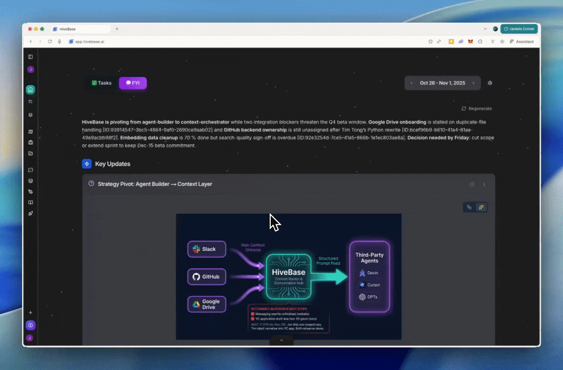 The source-of-truth stays visible while you chat, so you can cross-check details and move from comprehension to action—without context-switching back to Slack, Linear, or Google Drive.