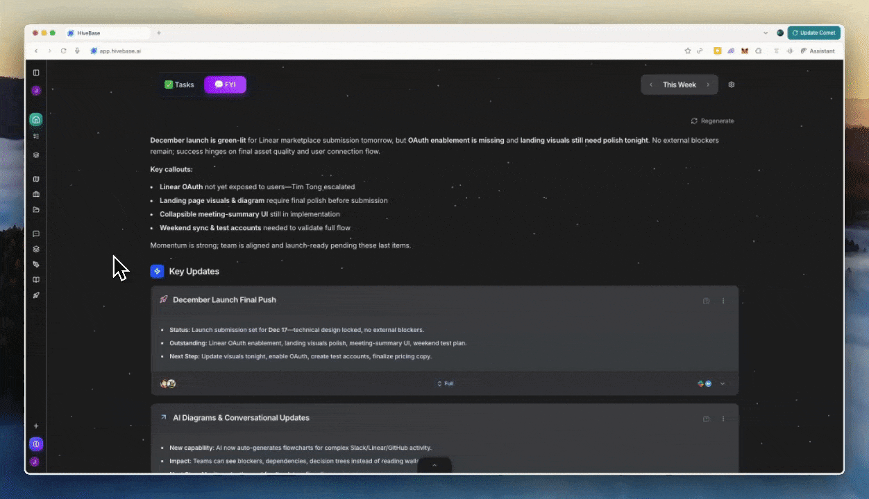When the AI analyzes your team's activity—Slack threads, Linear issues, GitHub PRs, meeting notes—it now automatically generates flowcharts for anything complex: blockers, multi-step processes, cross-team dependencies, or decision trees.