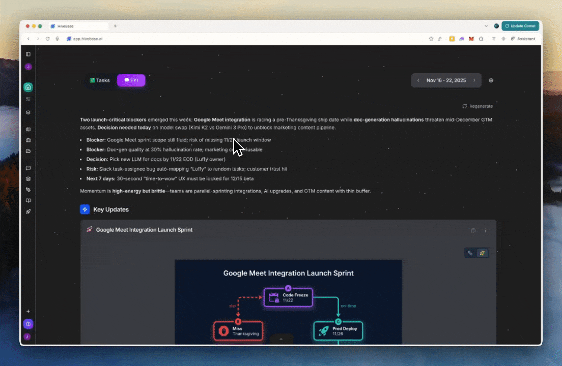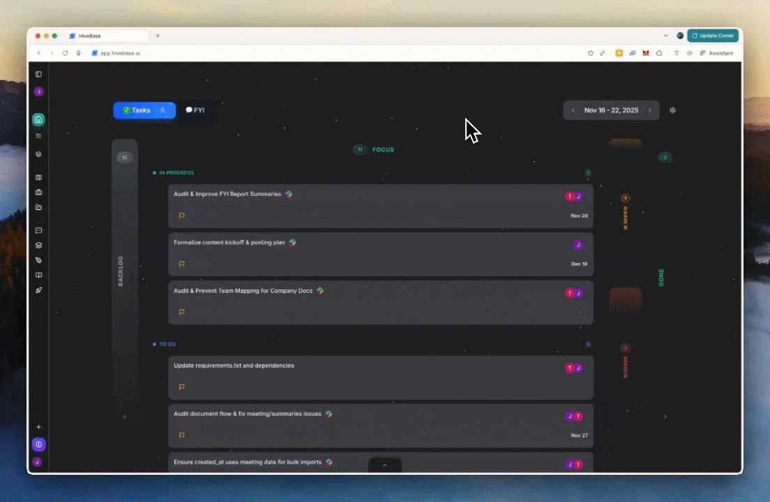 Hivebase starts listening in real-time, auto-detecting tasks, mentions, and updates as they happen.