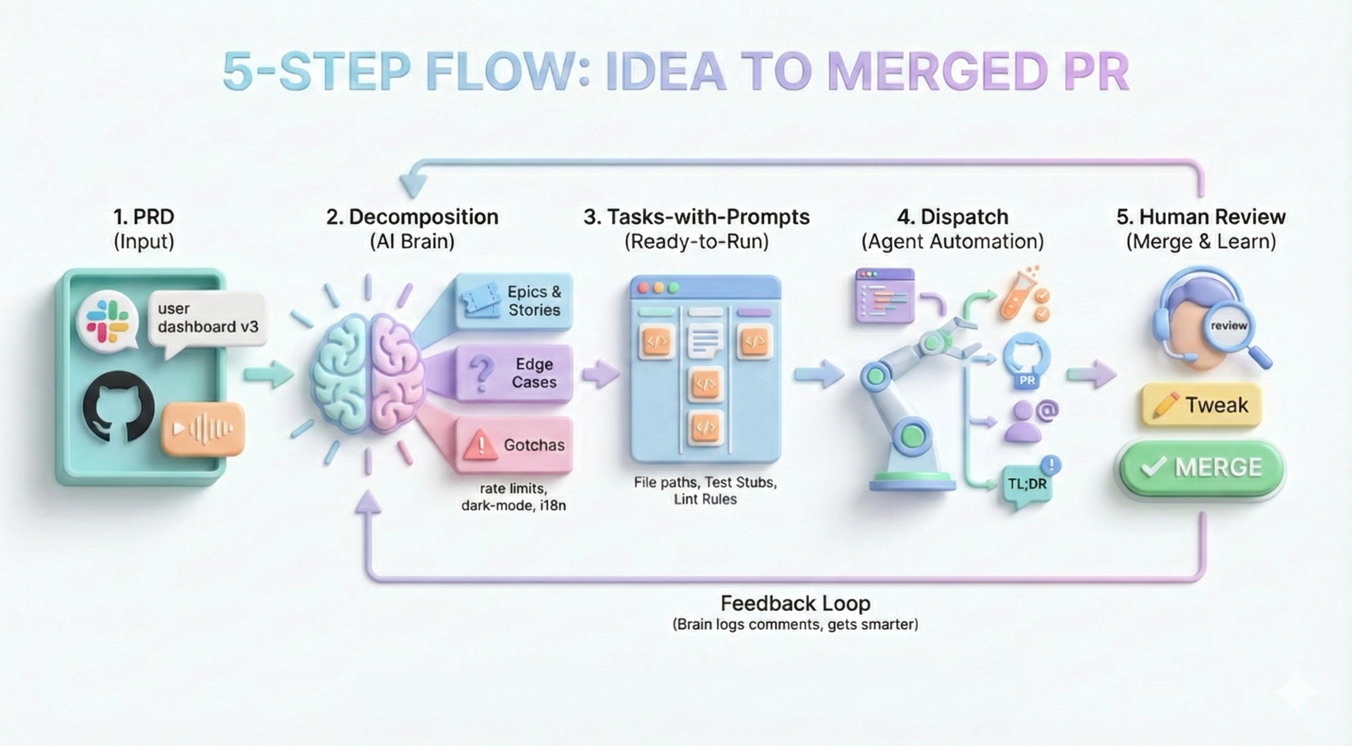 The pain: You drop a one-liner in Slack ("user dashboard v3") and still end up re-typing specs, edge-cases, and lint rules into Cursor or Devin. You're the human clipboard between half-baked ideas and working code.